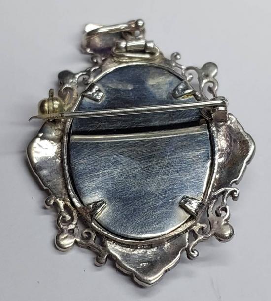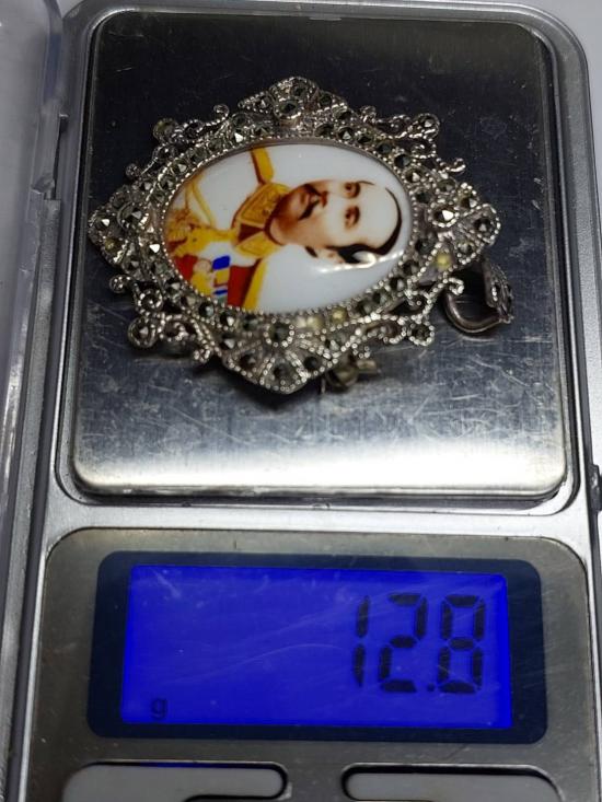 ล็อกเก็ตหรือเข็มกลัดโบราณ รูปพระบาทสมเด็จพระจุลจอมเกล้าเจ้าอยู่หัว (รัชกาลที่ 5) กรอบงานฝีมือประดับพลอยมาคาสไซต์ มีหลุดบ้างตามอายุการใช้งาน เงิน925
