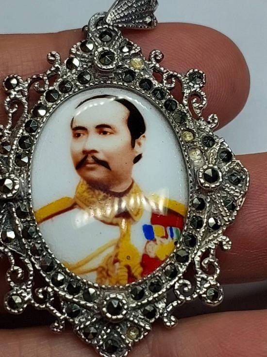 ล็อกเก็ตหรือเข็มกลัดโบราณ รูปพระบาทสมเด็จพระจุลจอมเกล้าเจ้าอยู่หัว (รัชกาลที่ 5) กรอบงานฝีมือประดับพลอยมาคาสไซต์ เงิน925