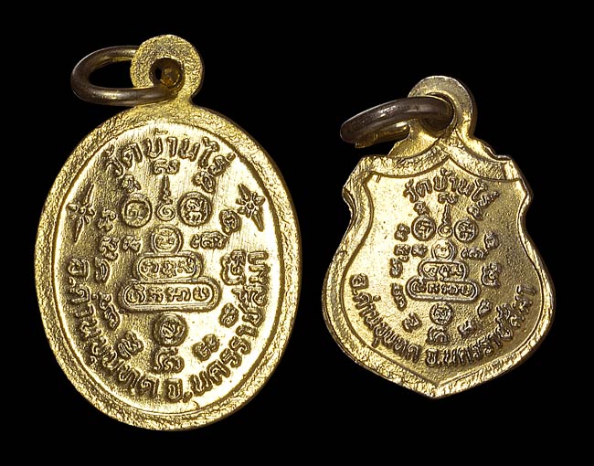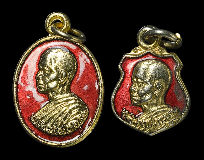 เหรียญเล็กรูปเหมือนหันข้าง ( พิมพ์อาร์ม และ พิมพ์เม็ดแตง ) เ นื้อกะไหล่ทอง ลงยาแดง พ.ศ.2535 ( รับพระ 2 เหรียญ )