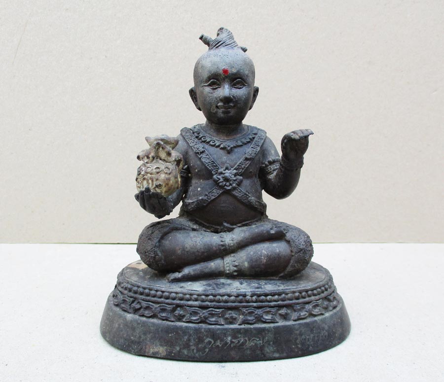 กุมารทอง ขนาดบูชา นั่งอุ้มถุงทอง 1000 ล้าน กวักทรัพย์ หลวงปู ่ ชื่น ติคญาโณ วัดตาอี จ.บุรีรัมย์ รุ่นรับทรัพย์ พ.ศ.2545 สู งร วมฐาน 7.5 นิ้ว เนื้อโลหะรมดำ ผิวแห้งคาหิ้ง !!