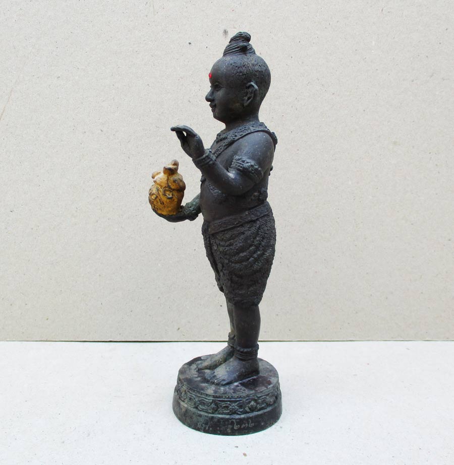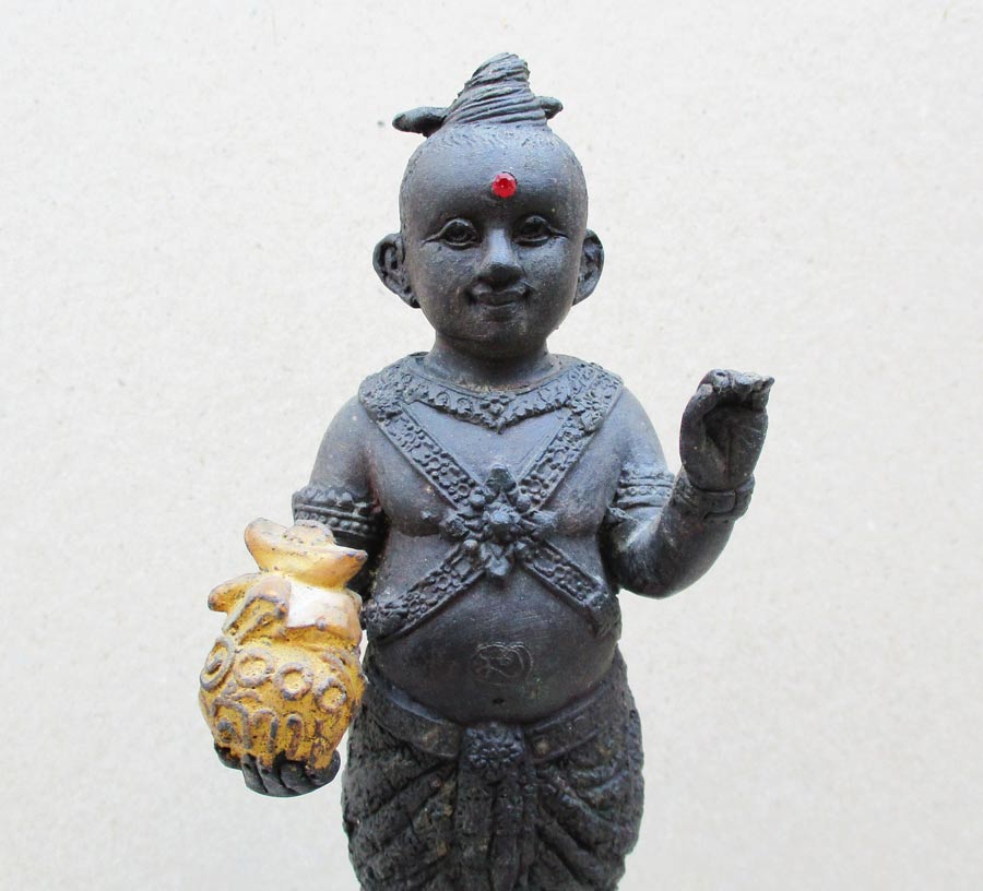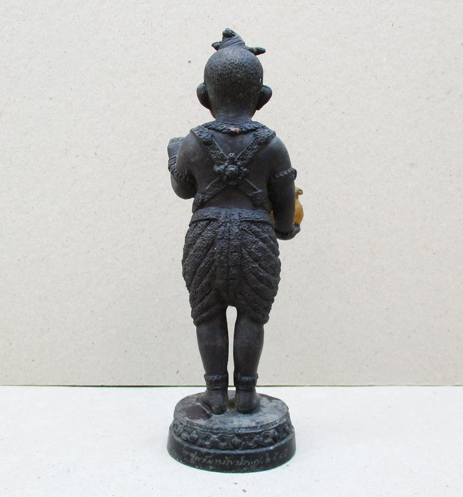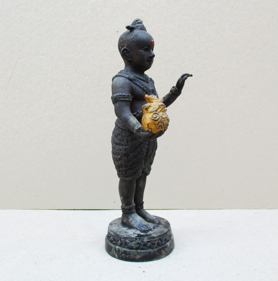 กุมารทอง ขนาดบูชา ยืนอุ้มถุงทอง 1000 ล้าน กวักทรัพย์ หลวงปู่ชื่น ติคญาโณ วัดตาอี จ.บุรีรัมย์ รุ่นรับทรัพย์ พ.ศ.2545 สูงรวมฐาน 7.5 นิ้ว เนื้อโลหะรมดำ ผิวแห้งคาหิ้ง !!