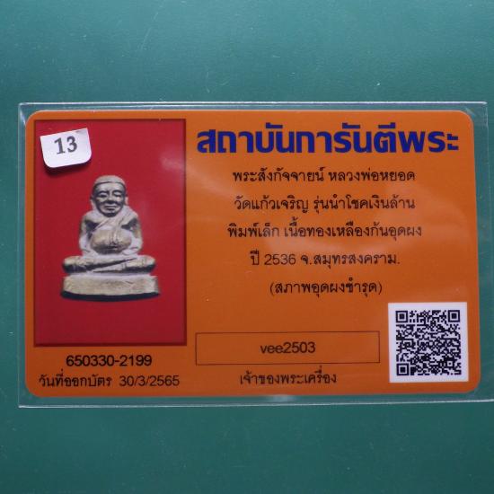 พระสังกัจจายน์หลวงพ่อหยอด รุ่นนำโชคเงินล้าน พิมพ์เล็ก เนื้อทองเหลืองก้นอุดผง วัดแก้วเจริญ ปี 2536.....13 ...(69.2.12