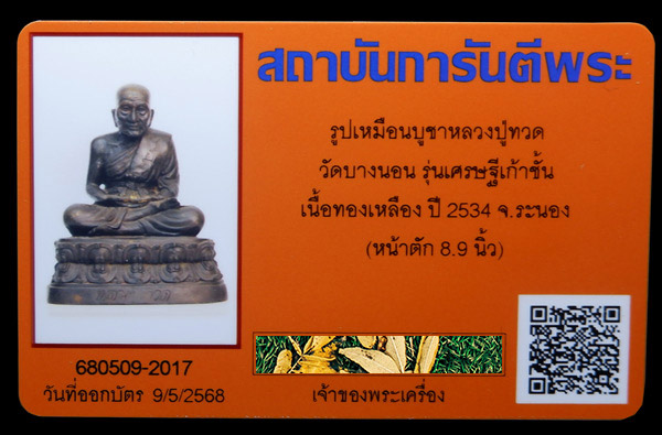 พระบูชาหลวงพ่อทวด วัดบางนอน จ.ระนอง รุ่นเศรษฐี 9 เก้าชั้น ปี พ.ศ.2534 เนื้อทองเหลือง ขนาดหน้าตัก 9 นิ้ว พร้อมบัตรรับรอง