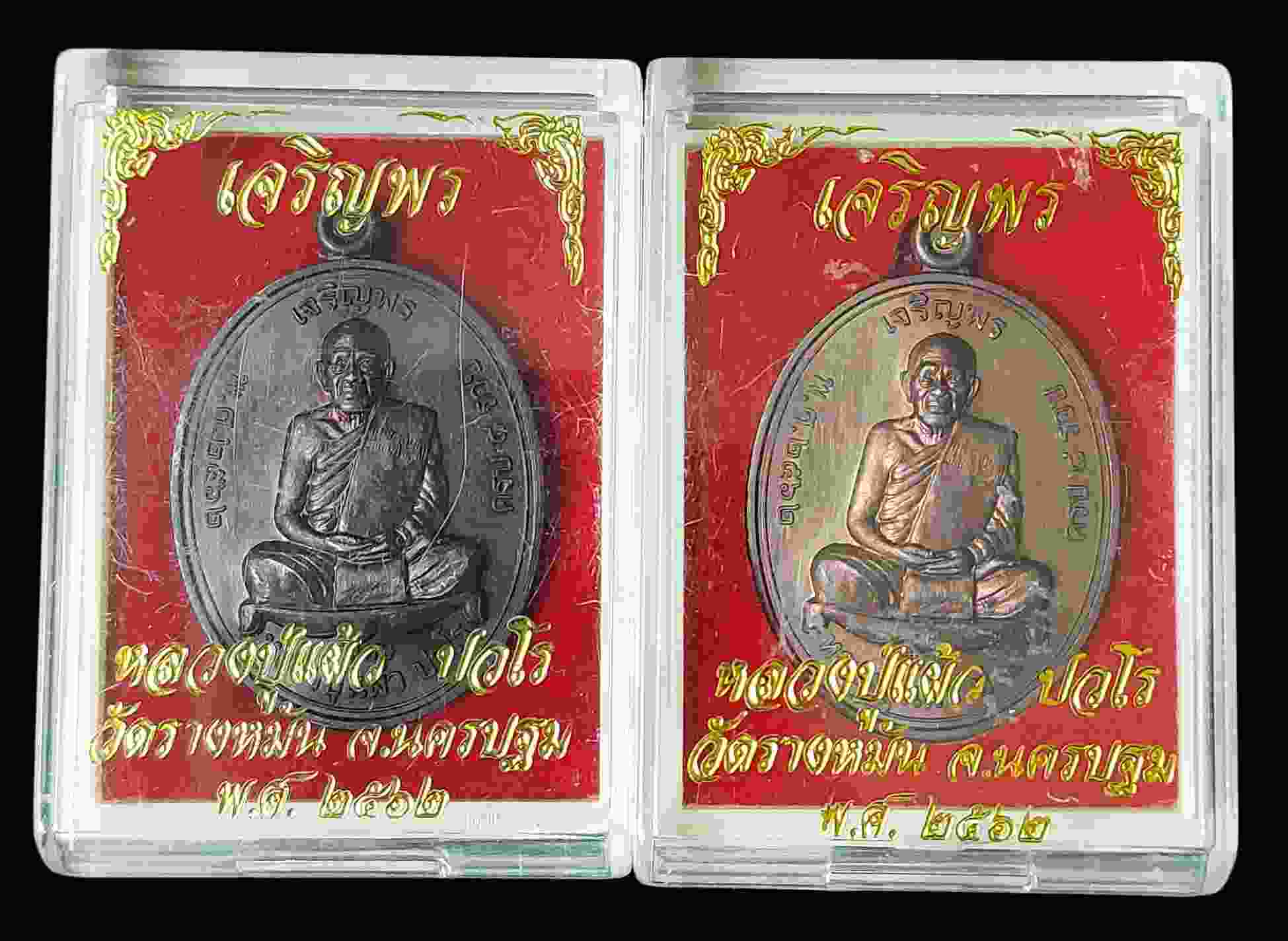 วัดใจเคาะเดียวแดง 2องค์ เหรียญเจริญพรบน อายุ ๙๖ ปี ๘ รอบ หลวงปู่แผ้ว วัดรางหมัน เนื้อทองแดงสภาพสวยพร้อมกล่องเดิม |