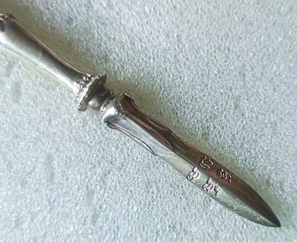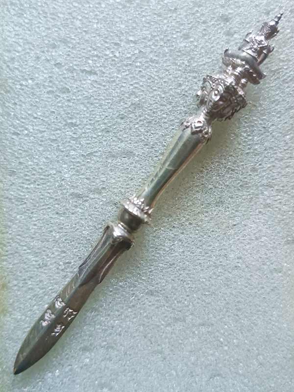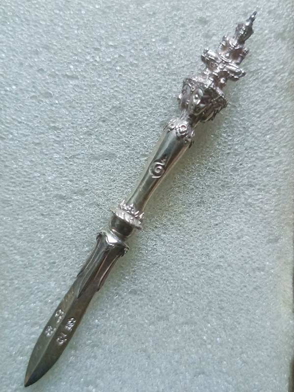 พระขรรค์จักรพรรดิ์ เนื้อเงิน ความยาวรวมทั้งหมด 8 เซนติเมตร หลวงตาม้า วัดถ้ำเมืองนะ จ.เชียงใหม่ ( หายาก สร้างน้อย มีรอยจารลายมือหลวงตาม้าชัดเจนตามรูปถ่ายครับ หลวงตาม้า ท่านเป็นศิษย์เอกของ หลวงปู่ดู่ )