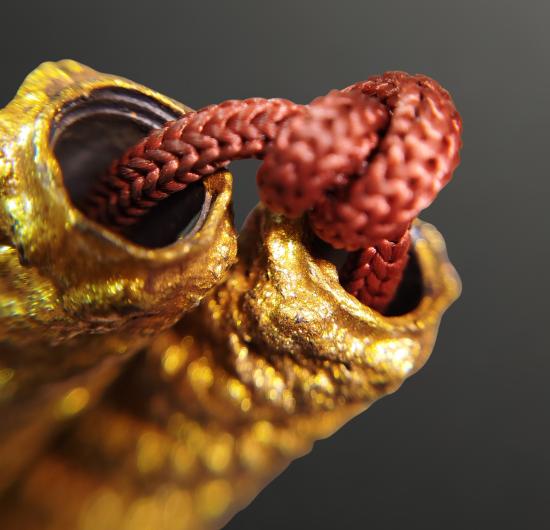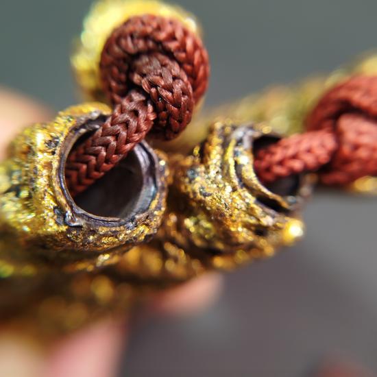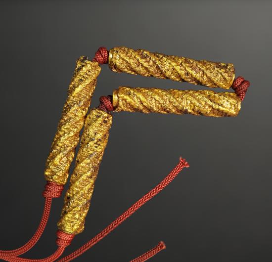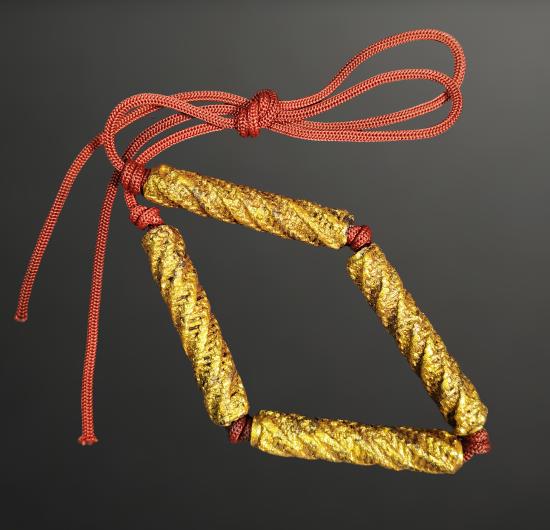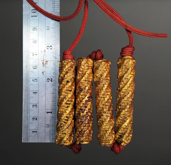 ตะกรุดถักเชือกเนื้อตะกั่ว คาดเอว ไม่ทราบที่ ขนาดตะกรุดยาวดอกละ 2.5 นิ้ว ร้อยเชือกแดง มีสีดอก รายการวัดใจ |