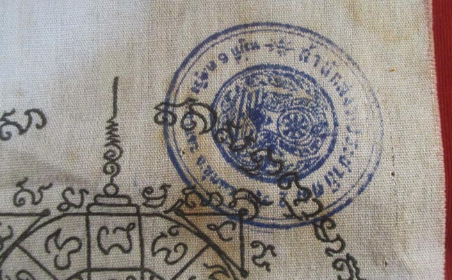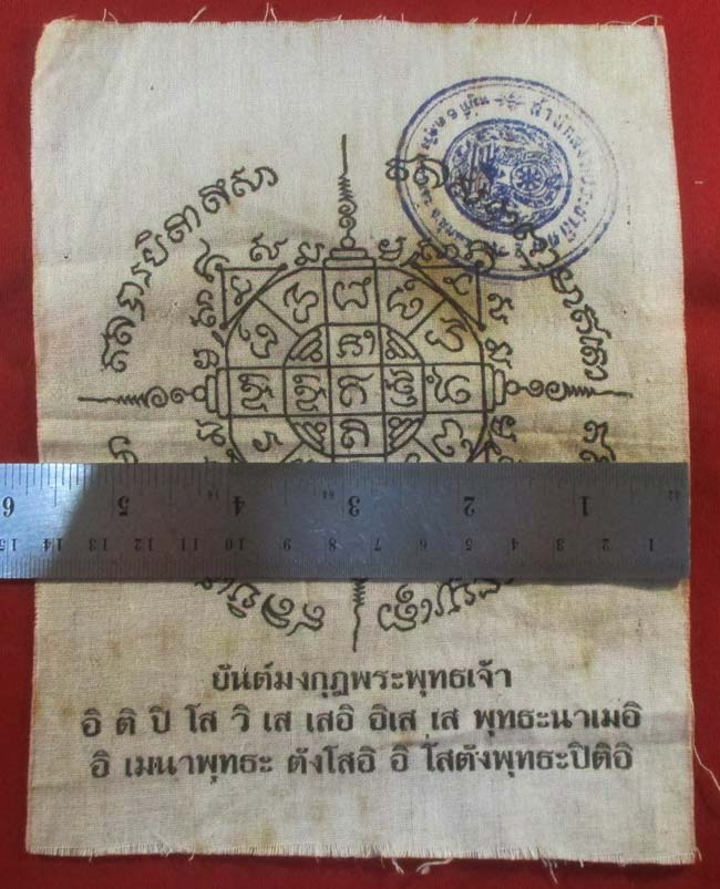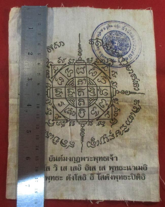 ผ้ายันต์ มงกุฏพระพุทธเจ้า ไม่ทราบที่ มีตราวัดแต่ผมอ่านไม่ออก ครับ (พระบ้าน ครับ) |