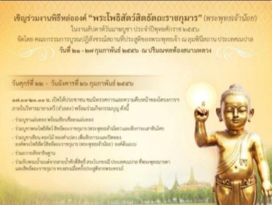 ~พิธีจะมีขึ้นตั้งแต่วันที่ ๒๑-๒๗ กุมภาพันธ์ ๒๕๕๖ เวลา ๐๗.๐๐ -๒๐.๐๐ น. โดยภายในงานท่านจะได้ร่วมปิดทององค์พระพุทธเจ้าน้อยต้นแบบ สักการะเสาหินอโศก(จำลอง) ดินและน้ำจากสถานที่ประสูติ จึงขอเชิญพี่น้องชาวไทยรวมหัวใจ ร่วมหล่อองค์พระพุทธเจ้าน้อยจากแผ่นทองที่พี่น้องชาวไทยได้ร่วมทำบุญด้วยกันมาตั้งแต่ต้น ในวันที่ ๒๗ กุมภาพันธ์ เวลา ๑๖.๐๐ น. ณ ท้องสนามหลวง (ทีมงาน)คณะกรรมการโครงการบูรณปฏิสังขรณ์ สถานที่ประสูติของพระพุทธเจ้า จัดพิธีสมโภช และพุทธาภิเษกพระพุทธเจ้าน้อยทำจากทองสำริด ขนาด ๓.๓๕ เมตร