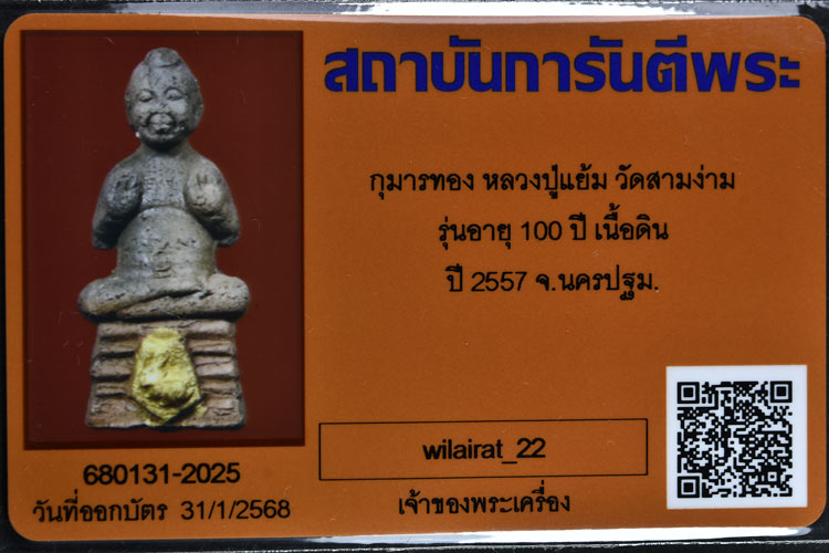 กุมารทอง หลวงปู่แย้ม วัดสามง่าม ปี57 รุ่น100ปี เนื้อดิน พร้อมบัตรรับรอง |