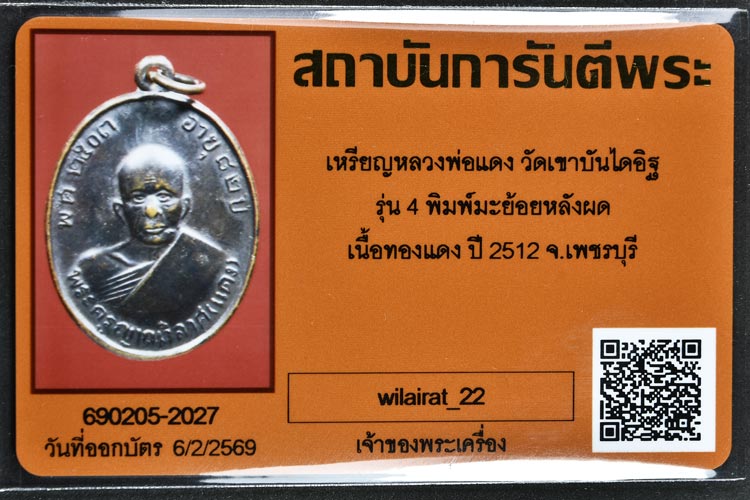 เหรียญหลวงพ่อแดง วัดเขาบันไดอิฐ รุ่น4 มะย้อยหลังผด ปี12 เนื้อทองแดง พร้อมบัตรรับรอง