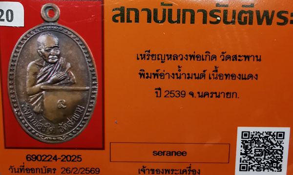 เหรียญหลวงพ่อเกิด วัดสะพาน พิมพ์อ่างน้ำมนต์ เนื้อทองแดง ปี2539 จ.นครนายก + บัตร G-pra สภาพเดิมค่ะ สภาพตามรูปทุกประการค่ะ