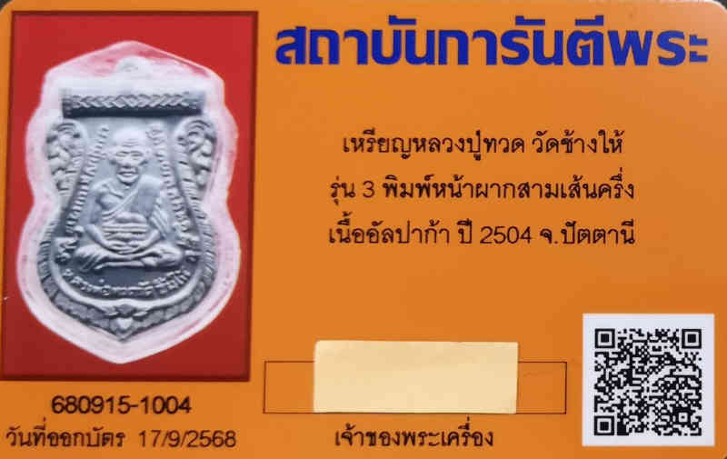 เหรียญหลวงปู่ทวด วัดช้างให้ รุ่น3 พิมพ์หน้าผากสามเส้นครึ่ง เนื้ออัลปาก้า ปี 2504 จ.ปัตตานี มีบัตรรับรองการันตรีพระ