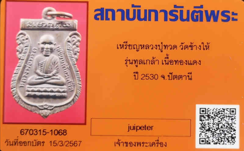 เหรียญหลวงปู่ทวด วัดช้างให้ รุ่นทูลเกล้า เนื้อทองแดง ปี 2530 จ.ปัตตานี พร้อมบัตรรับรอง