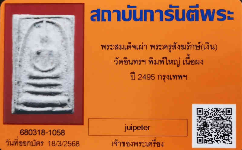 พระสมเด็จเผ่า พระครูสังฆรักษ์(เงิน) วัดอินทรฯ พิมพ์ใหญ่ เนื้อผง ปี 2495 พร้อมบัตรรับรองการันตรีพระ