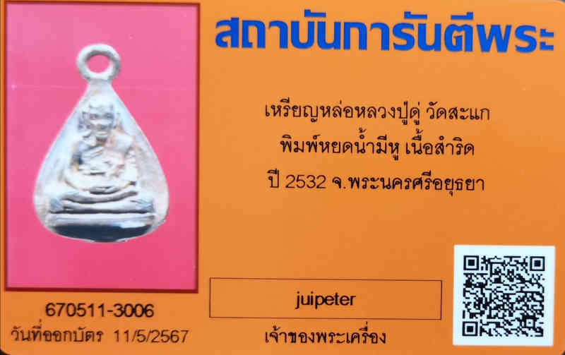 เหรียญหล่อหลวงปู่ดู่ วัดสะแก พิมพ์หยดน้ำมีหู เนื้อสำริด ปี 2532 พร้อมบัตรรับรองการันตรีพระ