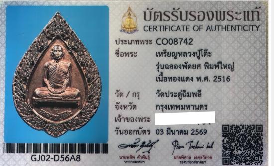 เหรียญฉลองพัดยศ หลวงปู่โต๊ะ วัดประดู่ฉิมพลี ปี 2516 พิมพ์ใหญ่ เนื้อทองแดงผิวไฟ สภาพสวย ใบหน้าหลวงปู่และตัวหนังสือคมชัดครับ จำนวนการสร้างน้อย (5,000 องค์) หายากครับ + พร้อมบัตรรับรองพระแท้สมาคมครับ
