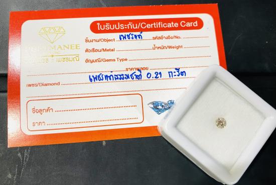 รายละเอียด เพชรแท้ธรรมชาติ เหลี่ยมเบลเยี่ยมคัต แกะจากตัวเรือนสินหลุดจำนำ น้ำหนัก 0.21 กะรัต น้ำประมาณ 96VS