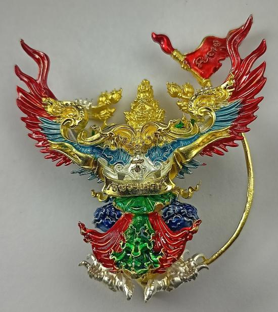 พญาครุฑทรงมหิธานุภาพ "เชิญธงมหาเศรษฐี(ครุฑรุ่น4)" วัดครุฑธาราม (จ.อยุธยา) เนื้อตริยะโลหะ ชุบ2K ลงยาราชาวดี (พิมพ์ใหญ่ สูง4.5ซ.ม.) เบอร์ 1099 พร้อมกล่องเดิมครับ