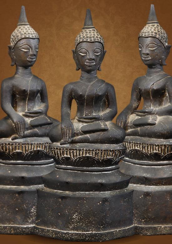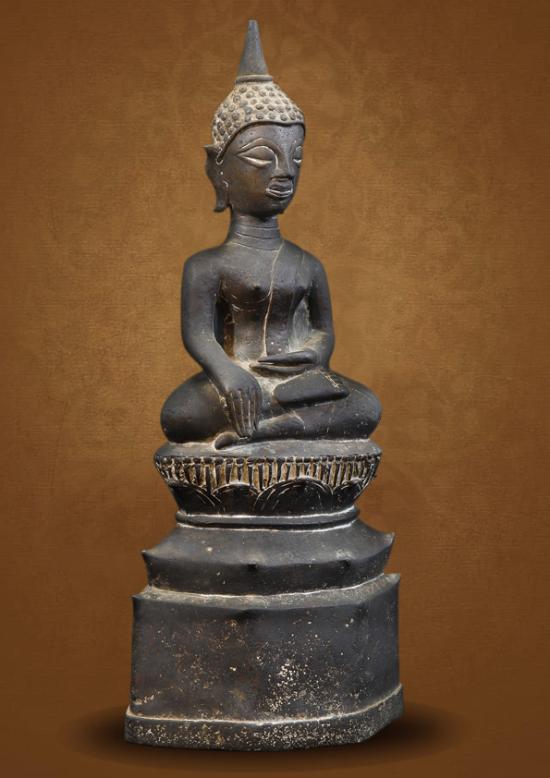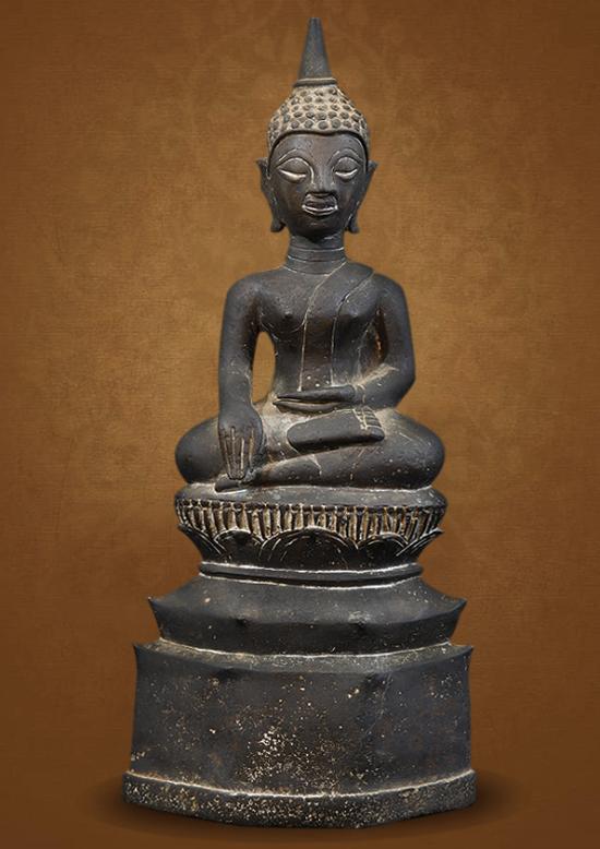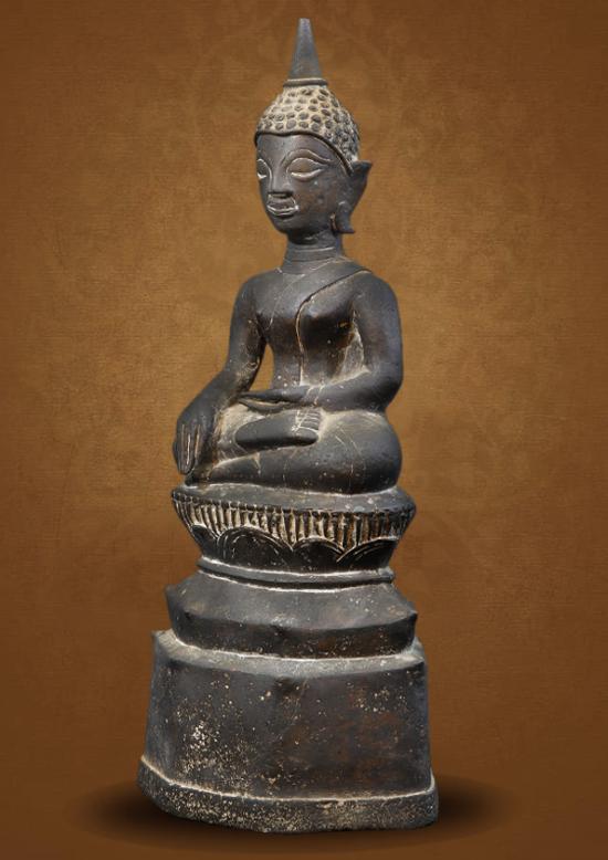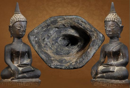 พระพุทธรูปสำริดปางมารวิไชย สมัยเชียงแสนแบบสิงห์๓ ฐานสำเภา (ลงกรุ) อายุราว ศตวรรษที่ 21-23 อายุราว 300-400 ปี ลงรักปิดทองแล้วขัดผิวโบราณ (ผิวขัดเก่า) ผิวหิ้งๆเดิมๆ ไม่มีอุดซ่อม -ขนาดหน้าตัก 3.5 นิ้