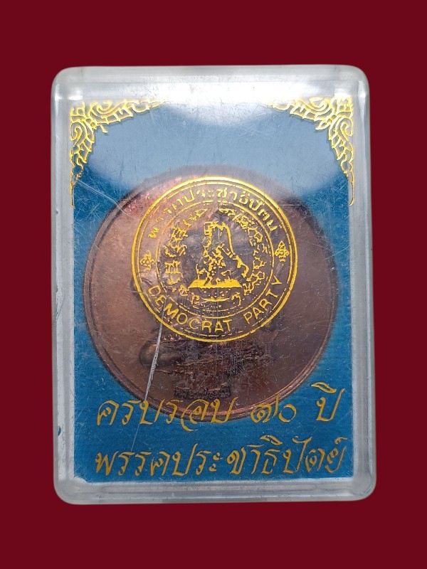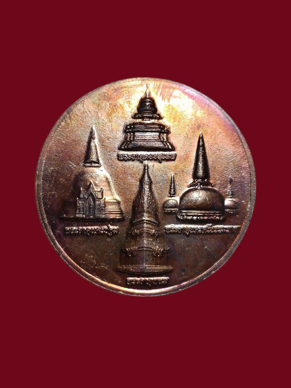 เหรียญกลมพระแม่ธรณี หลัง พระธาตุดอยสุเทพ พระธาตุนครปฐม พระธาตุนครศรีธรรมราช พระธาตุพนม 2559 ออกในงานครบรอบ 70 ปี พรรคประชาธิปัตย์