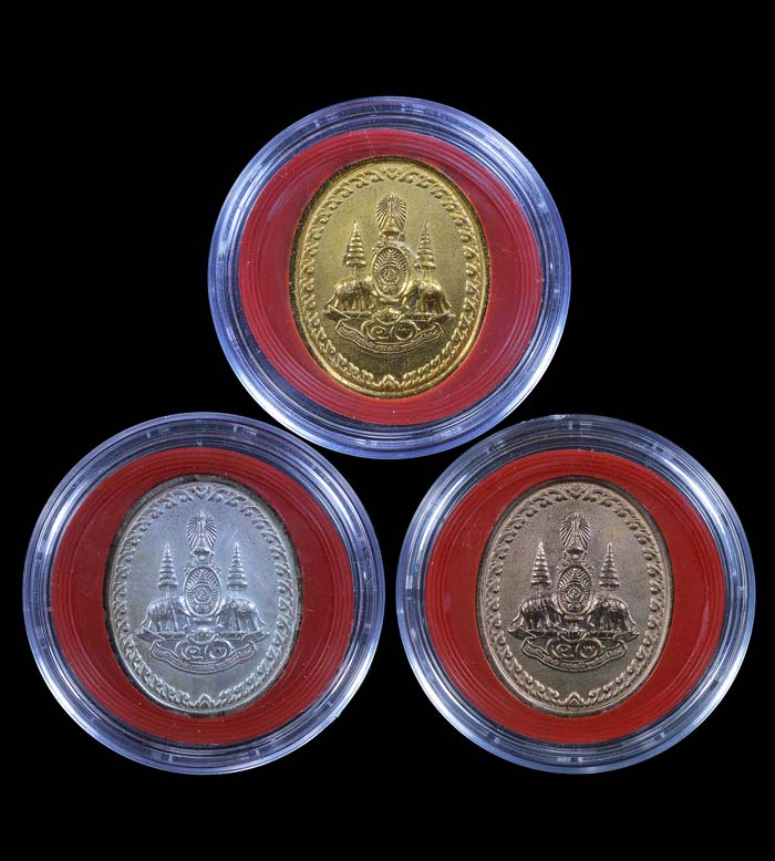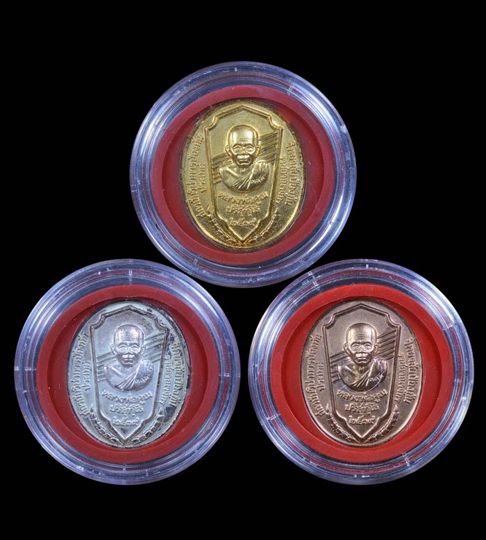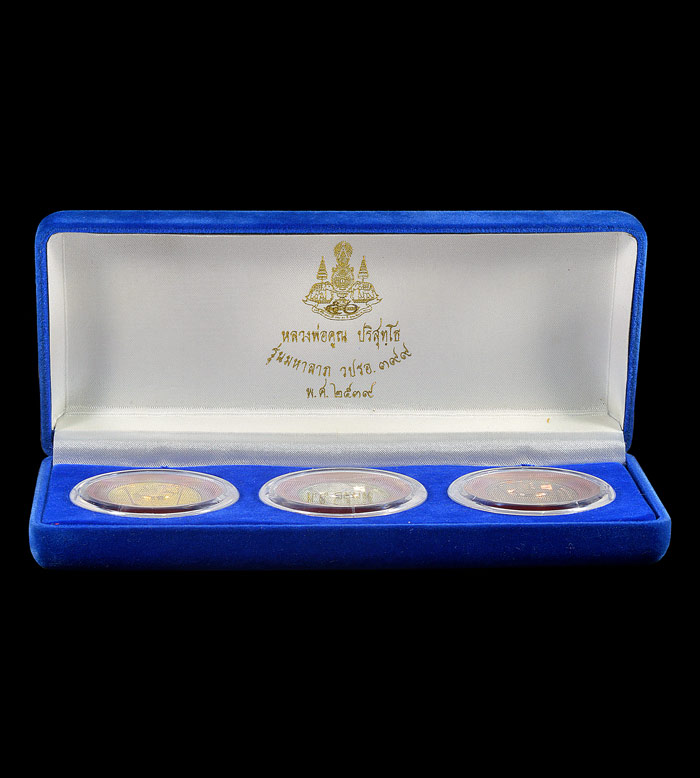 ชุด 3 เหรียญ รุ่น มหาลาภ วปรอ. 399 ( เนื้อกะไหล่พ่นทราย ทอง,เงิน,นาค ) พ.ศ.2539 ( กล่องเดิม )