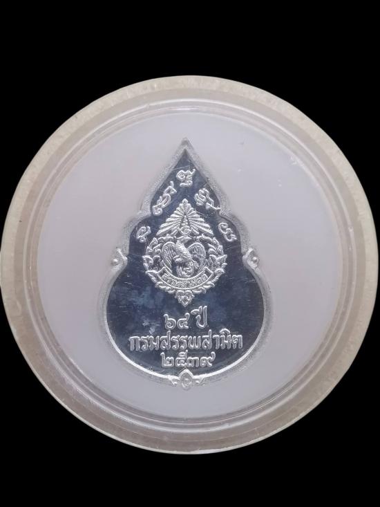 เหรียญพระแก้วมรกต ครบรอบ 64 ปี กรมสรรพสามิต พ.ศ.2539 เนื้อเงินขัดเงา ทรงหยดน้ำ พร้อมตลับ