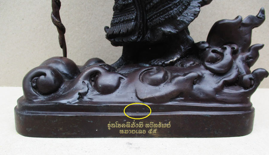 ภาพใต้ฐานขนาด 4.5 นิ้ว X 7.5 นิ้ว อุดปูน ฝังตลับบรรจุผงพุทธคุณ และปั๊มตราวัด ฯ