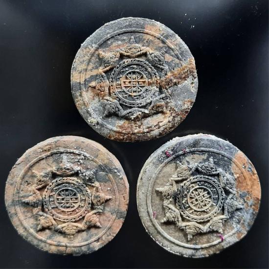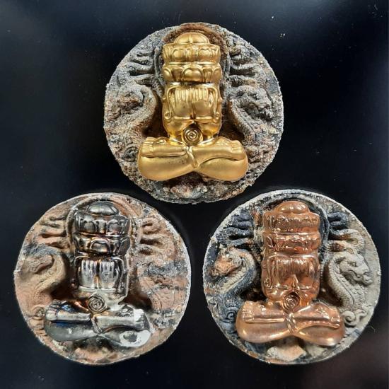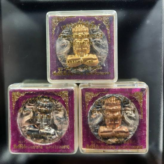 พระปิดตาพังพระกาฬ รุ่นบารมีศรีวิชัย เนื้อผงลายกั้นครก ปิดหน้ากากทอง,เงิน,นาค 1ชุด 3องค์ สภาพเดิม พร้อมกล่องเดิม