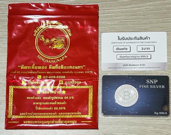 เงินแท่ง 1 บาท ในรูปทรง เหรียญบิทคอย แบรนด์ SNP พร้อมซองแดงและบัตรรับประกัน