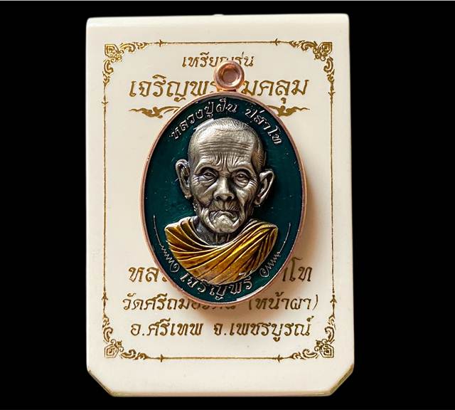 เหรียญรุ่น "เจริญพรห่มคลุม" หลวงปู่ฝั้น ปสาโท วัดศรีถมอรันต์(หน้าผา) จ.เพชรบูรณ์ ปี 2568 เนื้อทองแดงลงยาเขียว/ยาจีวร หน้ากากอัลปาก้าซาตินโค๊ด # 14 เคาะเดียวกล่องเดิมครับ