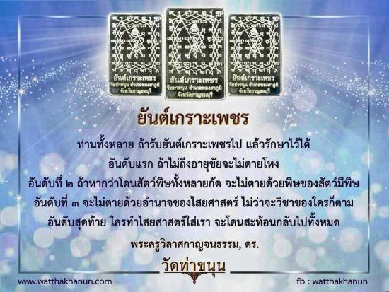 กระผม/อาตมภาพทำแผ่นยันต์เนื้อโลหะ ก็เพื่อท่านทั้งหลายที่ต้องการตะกรุดยันต์เกราะเพชร สามารถนำไปม้วนใช้งานได้เอง แล้วขณะเดียวกัน ถ้าต้องการชนวนในการหล่อพระ หรือว่าสร้างวัตถุมงคลก็สามารถที่จะบูชาไปเก็บเอาไว้ ต่อให้กระผม/อาตมภาพล่วงลับดับขันธ์ไปเป็น ๑๐ ปี ถ้าท่านมีแผ่นยันต์อยู่ ก็สามารถที่จะใช้เป็นชนวนในการสร้างวัตถุมงคลหรือว่าหล่อพระได้