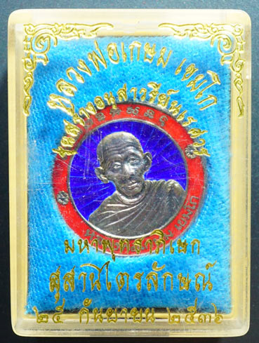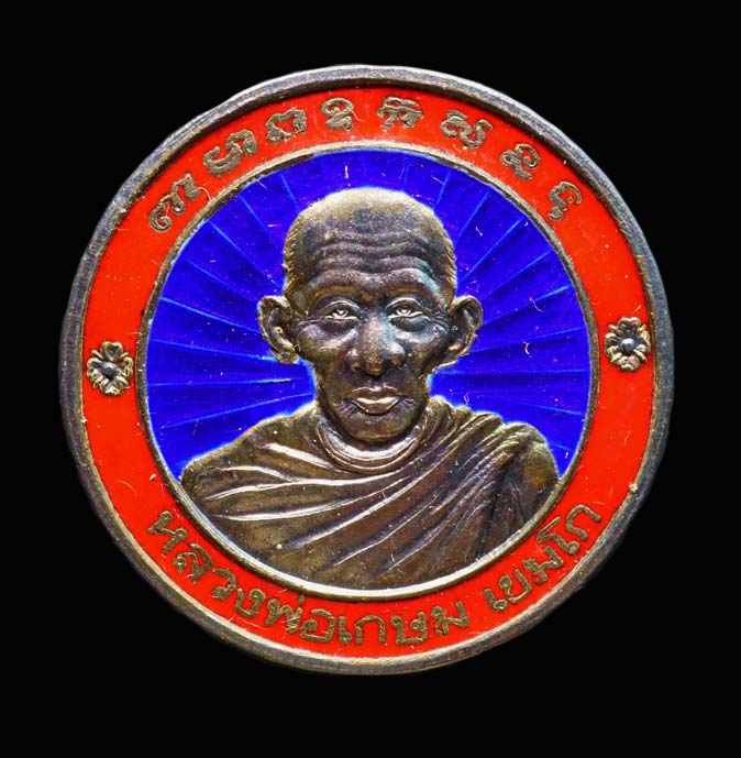 เหรียญกลมหลวงพ่อเกษม เขมโก รุ่นสร้างอนุสาวรีย์ สมเด็จพระนเรศวรมหาราช นครลำปาง เนื้อเงิน ลงยา