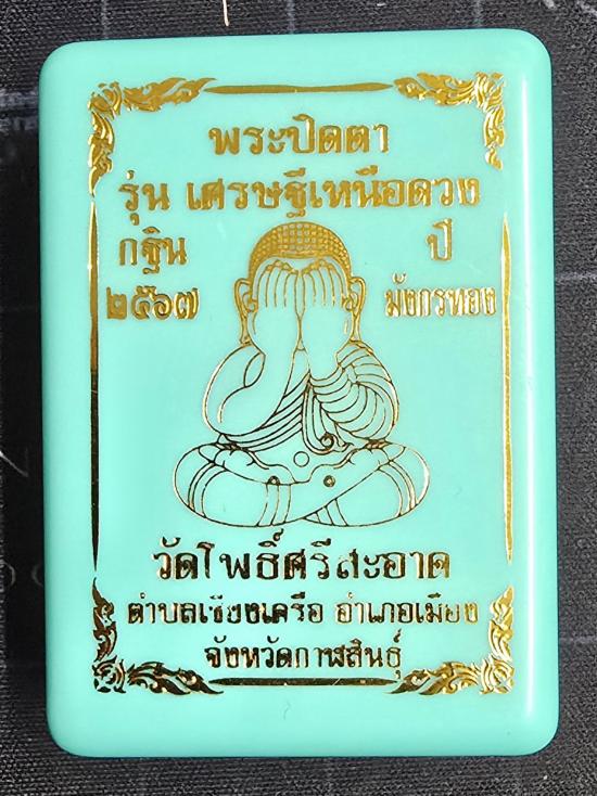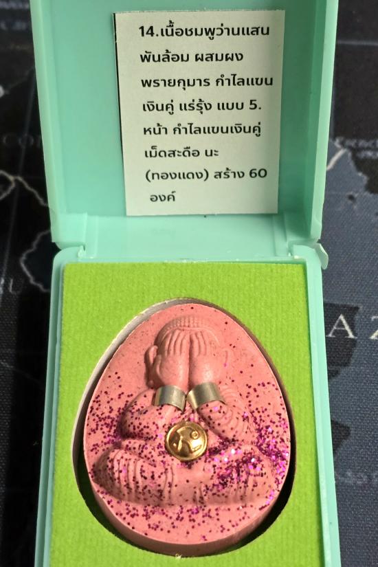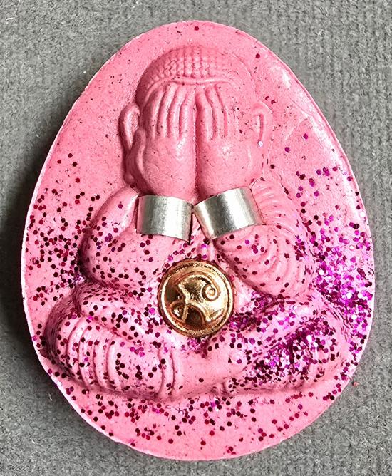 พระปิดตา "เศรษฐีเหนือดวง" วัดโพธิ์ศรีสะอาดแกเปะ จ.กาฬสินธุ์ (พระรุ่นนี้ปลุกเสก 3 วาระ และในวาระแรก หลวงปู่มหาศิลา ปลุกเสกอธิฐานจิตให้) เนื้อชมพูว่านแสนพันล้อม ผสมผงพรายกุมาร กำไลแขนเงินคู่ แร่รุ้ง แบ