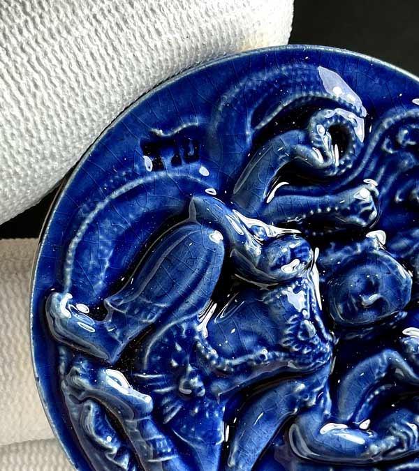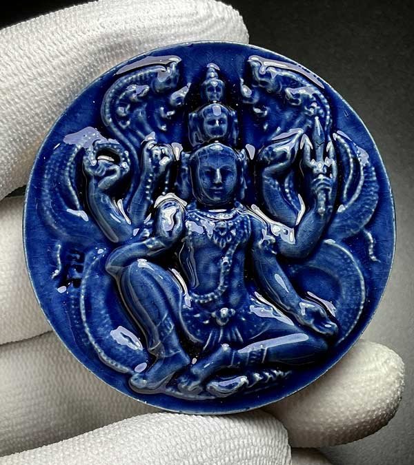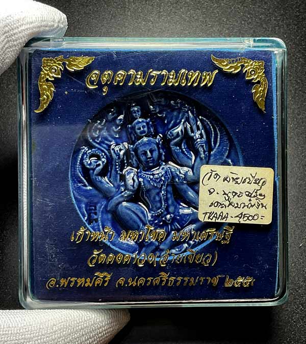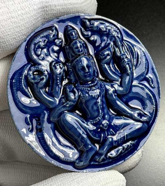 จตุคามรามเทพ รุ่น เก้าหน้ามหาโชค ( วัดอ้ายเขียว ) ปีพ.ศ. ๒๕๕๐ ขนาด 5.3 ซ.ม เนื้อกระเบื้องเคลือบน้ำเงิน โค้ค *รวย* สภาพสวยพร้อมกล่องเดิม