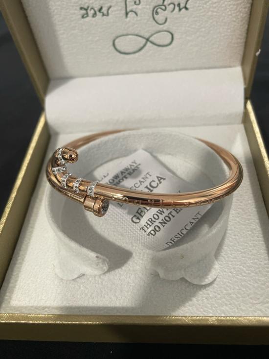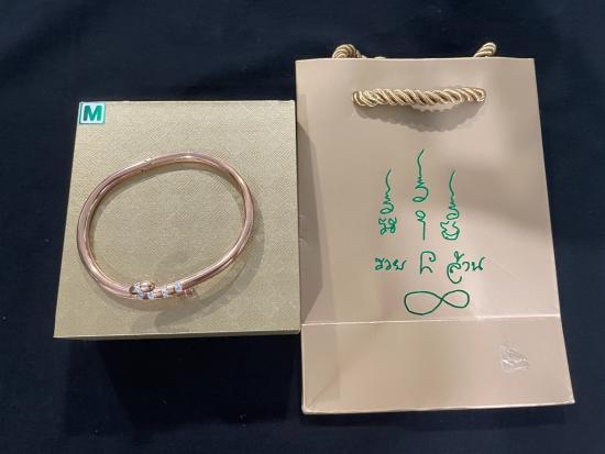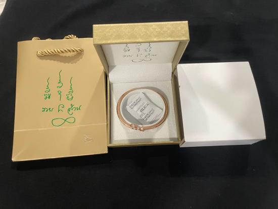 กำไลไม้เท้ารวยล้าน พิงค์โกล์ size M หลวงปู่ศิลา สิริจันโท พร้อมกล่องและถุงกระดาษจากวัด |