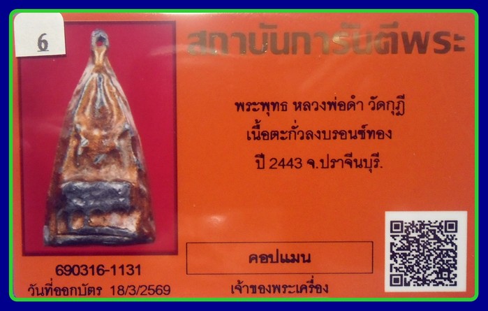 บัตรการันตี 800- พระพุทธเนื้อตะกั่วลงบรอนซ์ หลวงพ่อดำ วัดกุฏิ จ.ปราจีนบุรี |