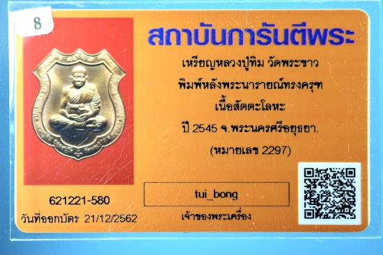 เหรียญหลวงปู่ทิม วัดพระขาว พิมพ์หลังพระนารายณ์ทรงครุฑ เนื้อสัตตะโลหะ ปี 2545 จ.พระนครศรีอยุธยา +บัตร G (หมายเลข 2297)