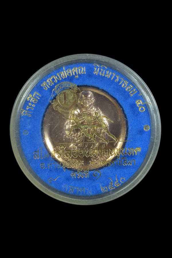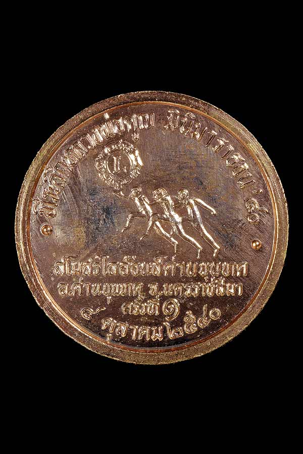 เหรียญ ที่ระลึก หลวงพ่อคูณ มินิมาราธอน ครั้งที่ 1 ( เนื้อทองแดงกะไหล่ทอง ) สนับสนุนโดย สโมสรไลอ้อนส์ ด่านขุนทด จัดแข่งขันในวันเกิดหลวงพ่อคูณ วันที่ 4 ตุลาคม พ.ศ.2540