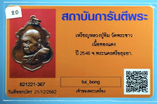 เหรียญหลวงปู่ทิม วัดพระขาว เนื้อทองแดง ปี 2546 จ.พระนครศรีอยุธยา + บัตร G |