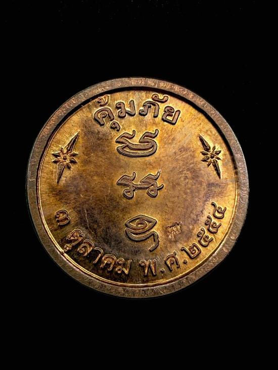 สำหรับเหรียญคุ้มภัยที่จะแจกให้ประชาชนในวันคล้ายวันประสูติปีนี้ สร้างทั้งหมด 30,000 เหรียญ ลักษณะของเหรียญมีขนาดเท่ากับเหรียญ 5 บาทปัจจุบัน ทำจากทองแดง ด้านหน้าเป็นรูปท้าวกุเวร หรือ ท้าวเวสสุวัณ เป็นเทพผู้รักษาทิศเหนือ ทรงเป็นอธิบดีของพวกอสูรและภูตผี โดยโบราณถือว่า เป็นพระโพธิสัตว์องค์หนึ่ง ที่มีหน้าที่ประสานความมั่งคั่ง ความมีโชคดีให้แก่ผู้บูชา นอกจากนี้ ในศาสนาพุทธนิกายมหายาน ลัทธิวัชรยาน กล่าวถึงท้าวกุเวร ว่า มีหน้าที่ทำสงครามปราบปิศาจและยักษ์มารต่างๆซึ่งเป็นศตรูต่อพระพุทธศาสนา และมีความสำคัญเด่นชัดว่าท่านเป็นเจ้าแห่งทรัพย์สมบัติและโชคลาภ