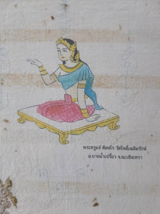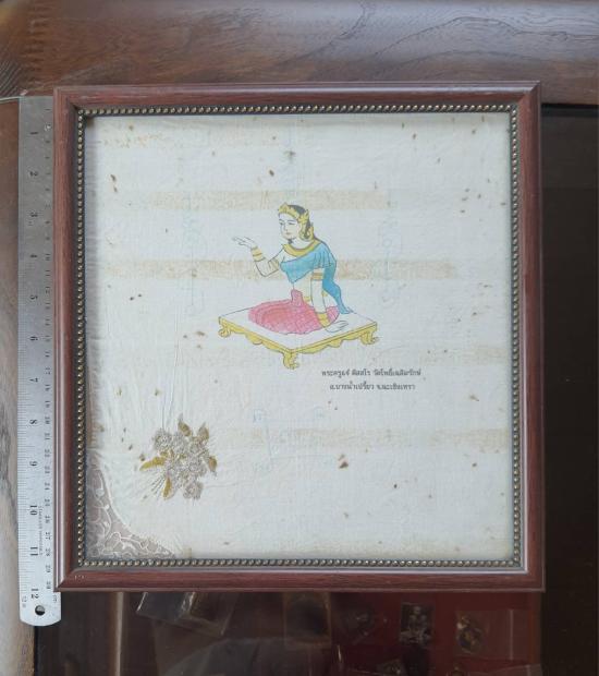 ผ้าเช็ดหน้านางกวัก หลวงพ่อแจ๋ วัดโพธิ์เฉลิมรักษ์ จ.ฉะเชิงเทรา(ขนาดประมาณ 11นิ้ว พร้อมกรอบไม้เก่า)...