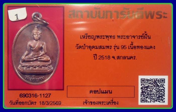 บัตรการันตี สวยมาก-750-เหรียญอาจารย์ฝั้น อาจาโร รุ่นที่ 95(พระเชียงแสน) พศ. 2518 เนื้อทองแดง |