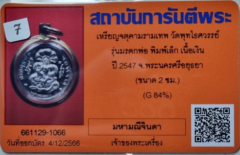 เหรียญเทวฤทธิ์ เนื้อเงิน วัดพุทไธศวรรย์ พิมพ์เล็ก 2 ซ.ม.จำนวนการสร้าง 747 เหรียญ หายากมาก เหรียญนี้หลวงพ่อหวลเมตตาอาจารให้สดๆ เลี่ยมทองผ่าหวาย พร้อมบัตรรับรองครับ