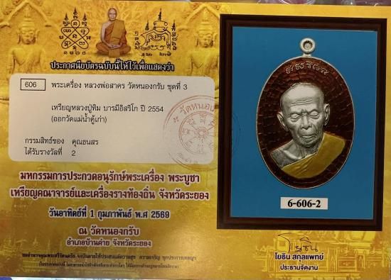 ใบประกาศ ที่ 2 งานวัดหนองกรับ *****เหรียญหลวงปู่ทิม เนื้อเงินลงยา สีแดง ออกวัดแม่น้ำคู้ ระยอง หลวงพ่อสาคร วัดหนองกรับปลุกเสก ปี 2554 สร้างน้อย 199 เหรียญ หมายเลขสวย 155 ปลุกเสกหอยันต์ วัดหนองกรับ พร้