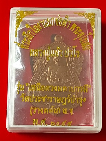 เหรียญรุ่นเหนือดวงมหาบารมี หลวงปู่แผ้ว ปวโร วัดรางหมัน นครปฐม ปี 2554 เนื้อทองแดง ตอกโค้ด ตอกเลข พร้อมกล่อง