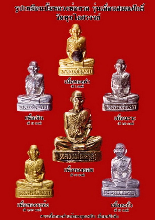 รูปเหมือนปั๊มหลวงพ่อหวล วัดพุทไธศวรรย์ เนื้อทองระฆังโบราณ(ชุบกะไหล่ทอง) จำนวนการจัดสร้างน้อย 4,999 องค์ จัดสร้างเนื่องใน วาระที่ หลวงพ่อหวล ท่านได้รับการแต่งตั้งเลื่อนสมณศักดิ์ที่ พระพุทไธศวรรย์วรคุณ เมื่อวันที่ 5 ธันวาคม 2551 ทางคณะศิษย์จึงใด้ขออนุญาตในการจัดสร้างวัตถุมงคล รุ่นเลื่อนสมณศักดิ์ ขึ้นโดยได้รวบรวมตะกรุดเก่าๆ ของหลายคณาจารย์ ของจังหวัดพระนครศรีอยุธยา พระปรุหนังและพระเนื้อชินที่ชำรุด ระฆังเก่าอายุหลายร้อยปี รวมทั้งเศษแร่ที่เหลือจาการสร้างวัตถุมงคลรุ่นก่อนๆ ของหลวงพ่อมาหลอม เพื่อเป็นชนวนในการสร้างรูปหล่อ รุ่นลื่อนสมณศักดิ์ และหลวงพ่อได้เมตตาอธิฐานจิตปลุกเสก ให้เมื่อวันที่ 23 กุมภาพันธ์ 52 จัดเป็นวัตถุมงคลของหลวงพ่อที่น่าบูชาครับ