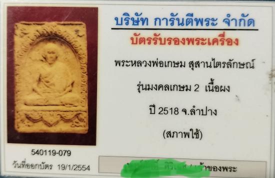 พระผงมลเกษม2 หลวงพ่อเกษม เขมโก พ.ศ.2517 พร้อมบัตรG
