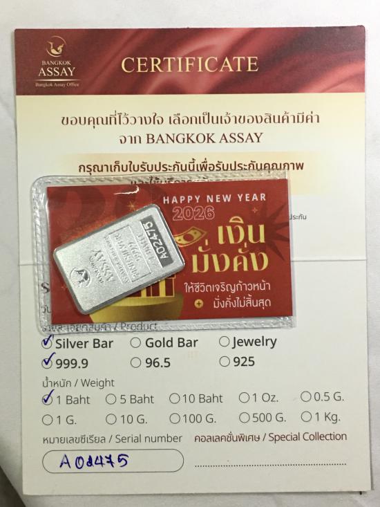 เงินแท่งบริสุทธิ์ 999.9% ขนาด 1 บาท หรือ FINE SILVER 999.9% พร้อม certificate