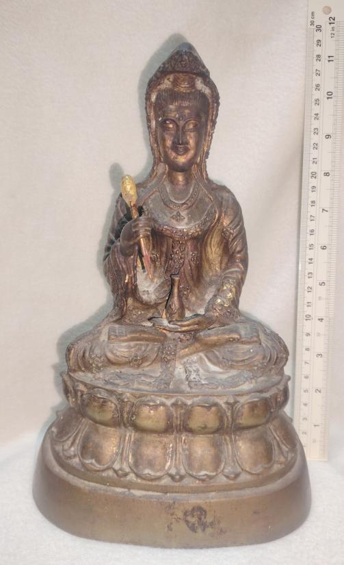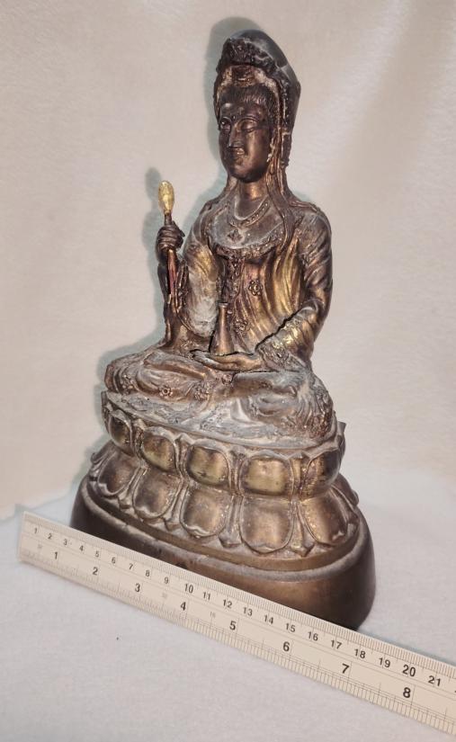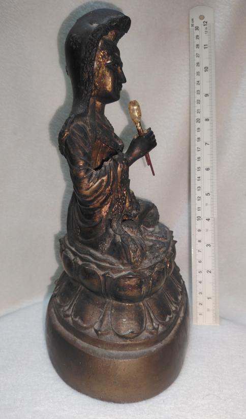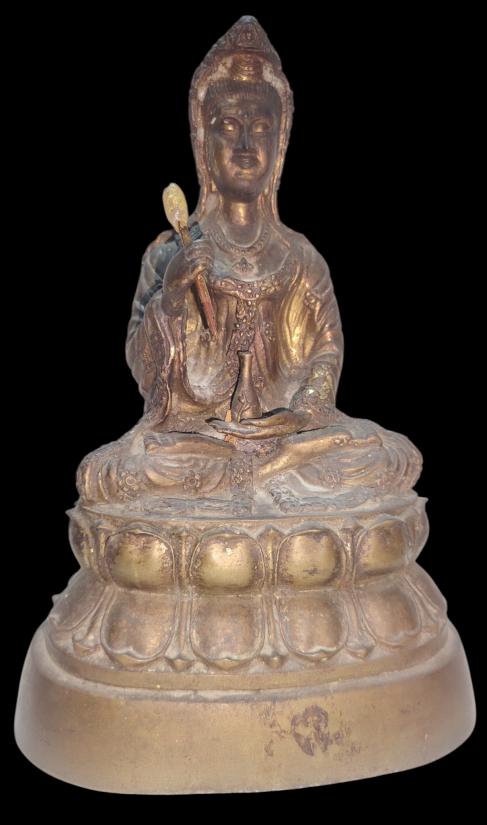 พระบูชาพระโพธิสัตว์เจ้าแม่กวนอิมปางประทานพรพรมน้ำมนต์จีวรดอกไม่ทราบที่หล่อได้หนาก้นดินไทยเก่ามีอายุเนื้อทองผสมเหมาบ้านมาเจ้าของเก่าบอกเป็นของวัดมังกรฆราวาส(เล่งเนยยี่)มือท่านถือก้านธูปในพิธีและเทียนชัยเสกเดิมๆได้มาแบยนี้เลยครับชอบพิจารณาแล้วใส่ราคาที่ใช่เลยครับท่านไม่แพงอย่างที่คิดในภาพมีเปิดแหลชกะแิดแฟลชแสงจะกลอกๆตาน่ะ
