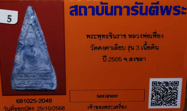 พระพุทธชินราช หลวงพ่อเฟื่อง วัดคงคาเลียบ รุ่น3 เนื้อดิน ปี2505 จ.สงขลา + บัตรG-pra สภาพเดิมค่ะ